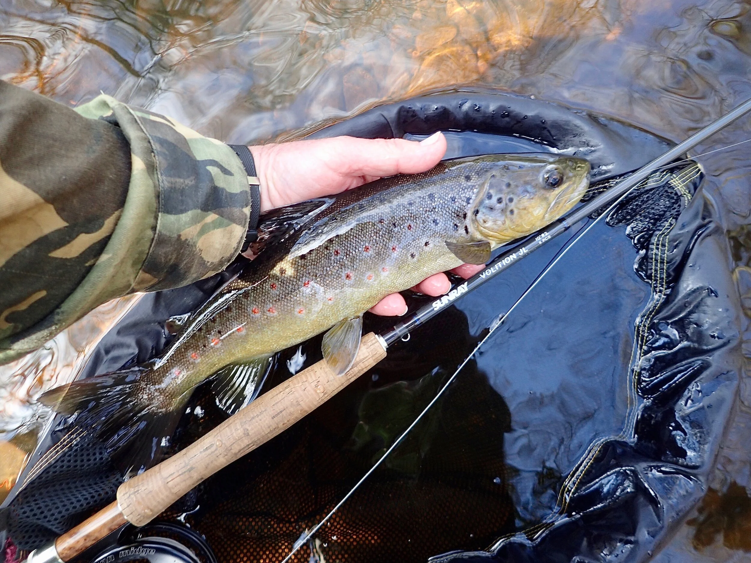 As for fly lines, I used to prefer double taper lines & still love my 2 weight DT silk line for fishing small streams with short rods. However I was transported into the modern world three years ago when I was introduced to the Sunray Micro Thin Jeremy Lucas lines which have a 12’ front taper down to 0.55mm diameter & which are significantly thinner than most conventional lines of the same weight. Their Thinness is due to their specific gravity being greater than 1 which, in theory, should make them sink, but thanks to their highly hydrophobic coating or the application of a suitable floatant they float surprisingly well (as do greased up silk lines that are also more dense than water). Their delicacy of presentation & casting ability is superb. I tend to use these micro thin lines even on the rare occassions that I fish with a streamer since I normally fish at as close a range as possible. As mentioned earlier I virtually always use a line 1 to 2 weights lighter than the rod’s designation (1 weight, 0 weight or micro nymph lines on my 10’ 2 weight, 1 weight or 2 weight on my 10’ 4 weight & 5 weight on my stiff 6 weight). Only when fishing at very close range on tiny brooks do I use a line weight the same as the rod’s designation in order to load the rod effectively.